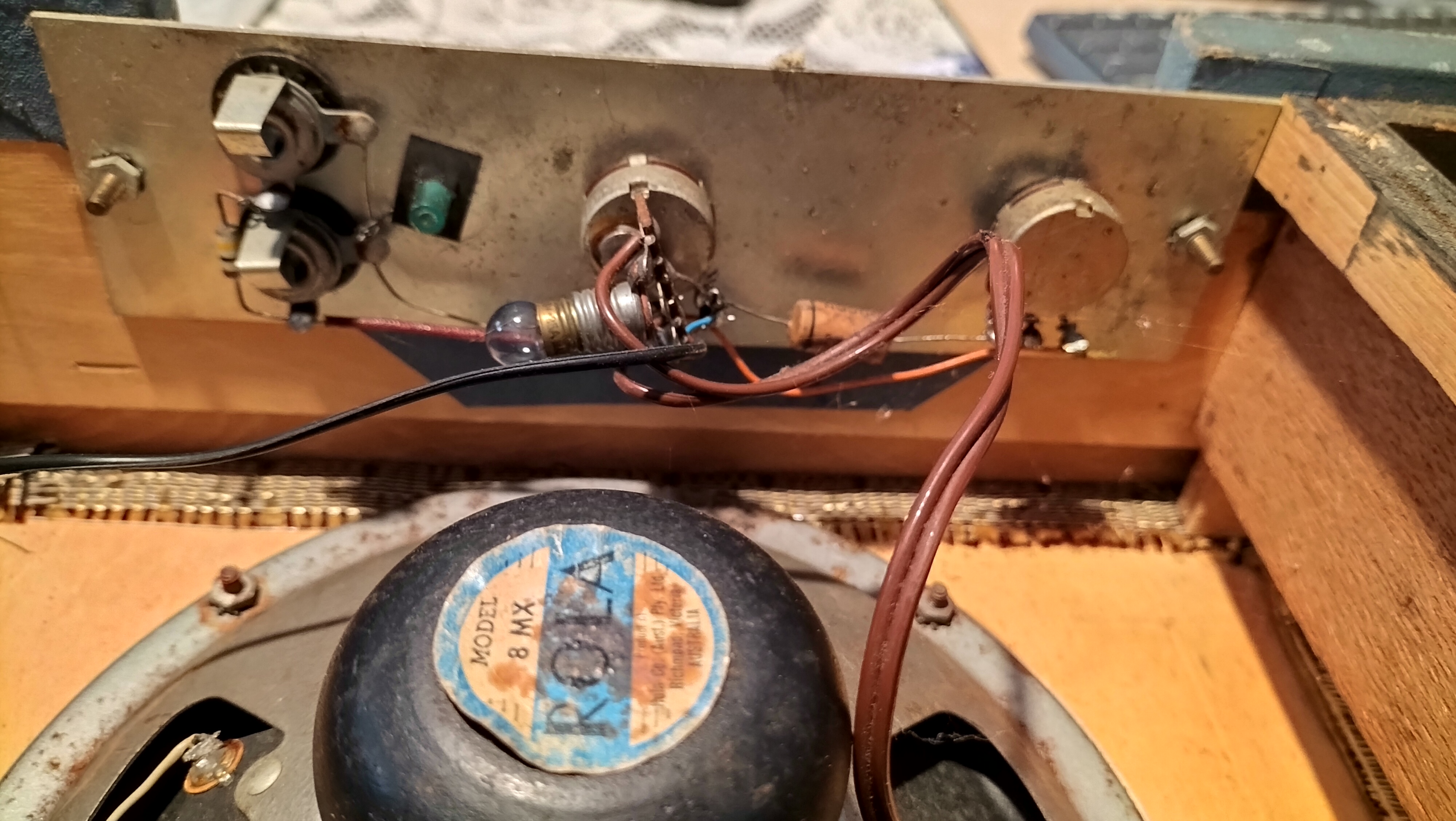 Note the Rola 8MX speaker, an 8-inch unit with a secondary co-axial whizzer cone denoted by the “X” for “extended” range.