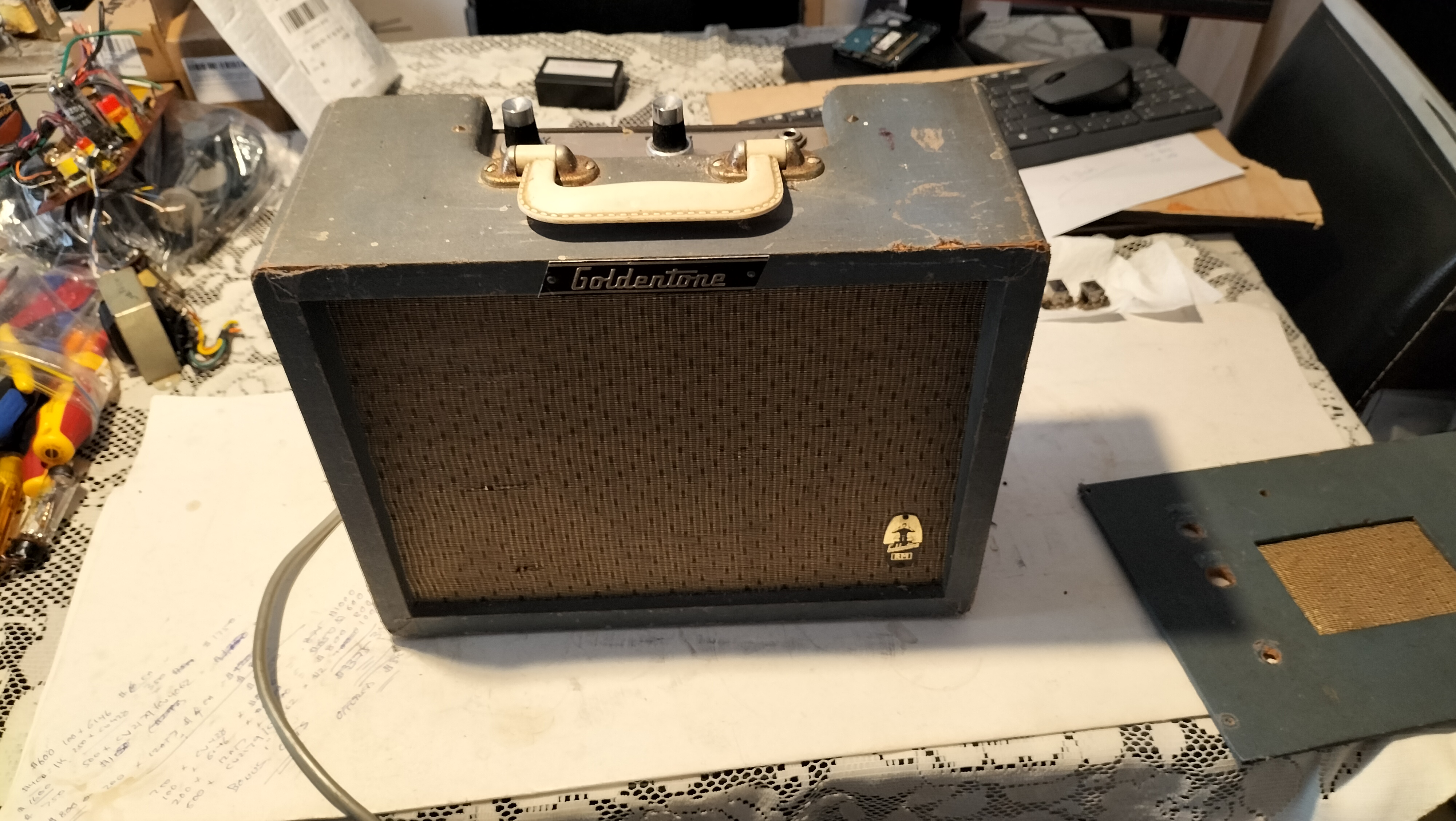 Contributing editor Ken Palethorpe comments:I very recently came into possession of a very old goldentone amp. After looking at your website (and grouse guitars) I think this dates from about 1959-1961.